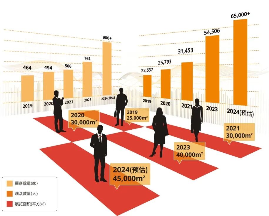 本屆展會(2024年)展覽面積將超過45,000平方米,中外展商約900家,參展品牌1500+個,國內外觀眾預計將達到65,000+人次。